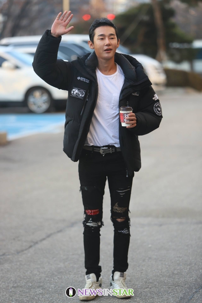 이날 허지웅이 출근길에 포즈를 취하고 있다.