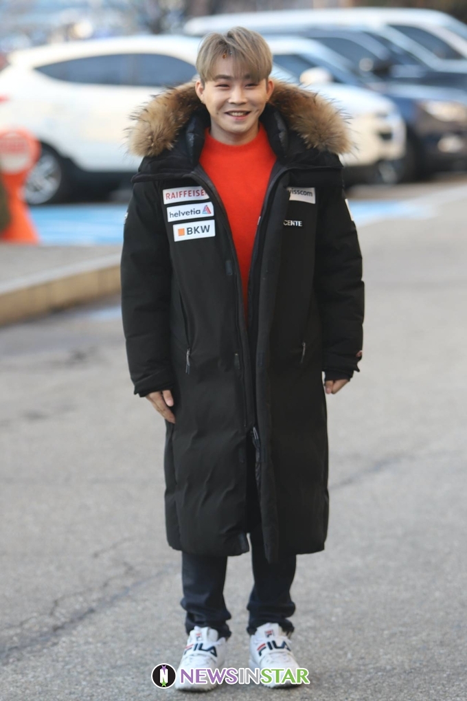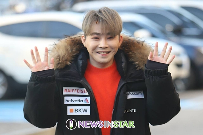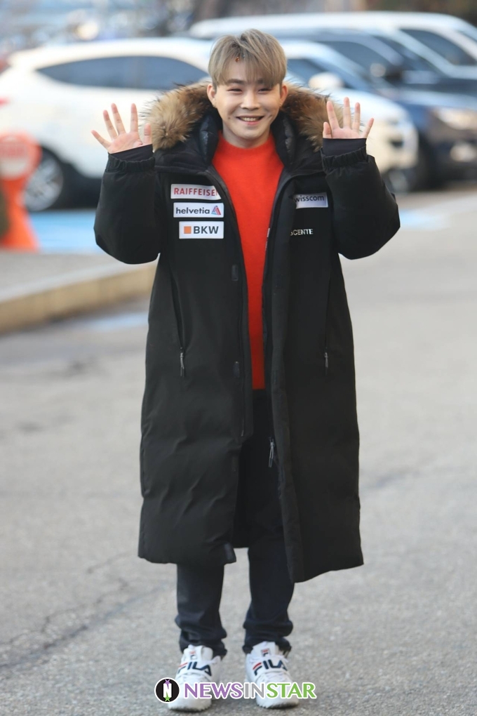 이날 백청강이 출근길에 포즈를 취하고 있다.