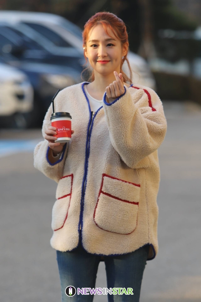 이날 오정연 아나운서가 출근길에 포즈를 취하고 있다.