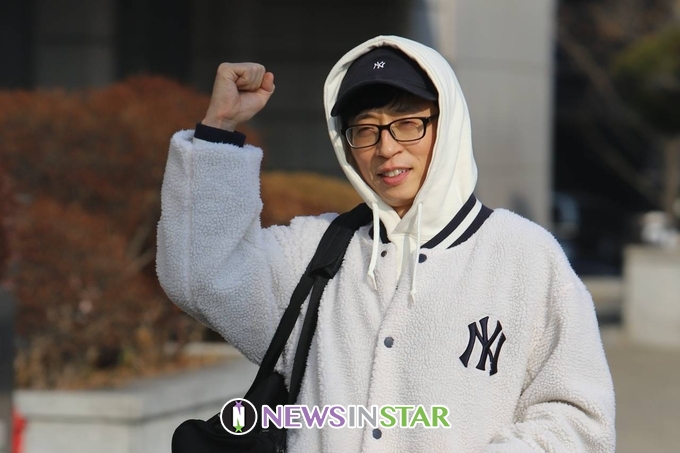 이날  유재석이  출근길에 포즈를 취하고 있다.