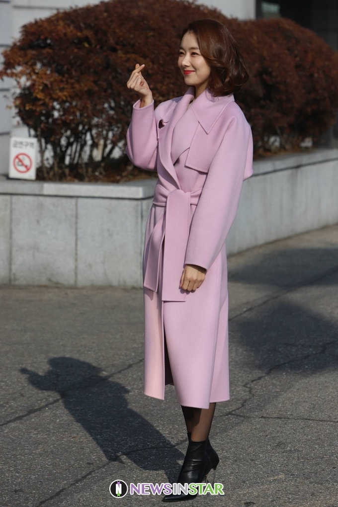 이날   소이현이  출근길에 포즈를 취하고 있다.