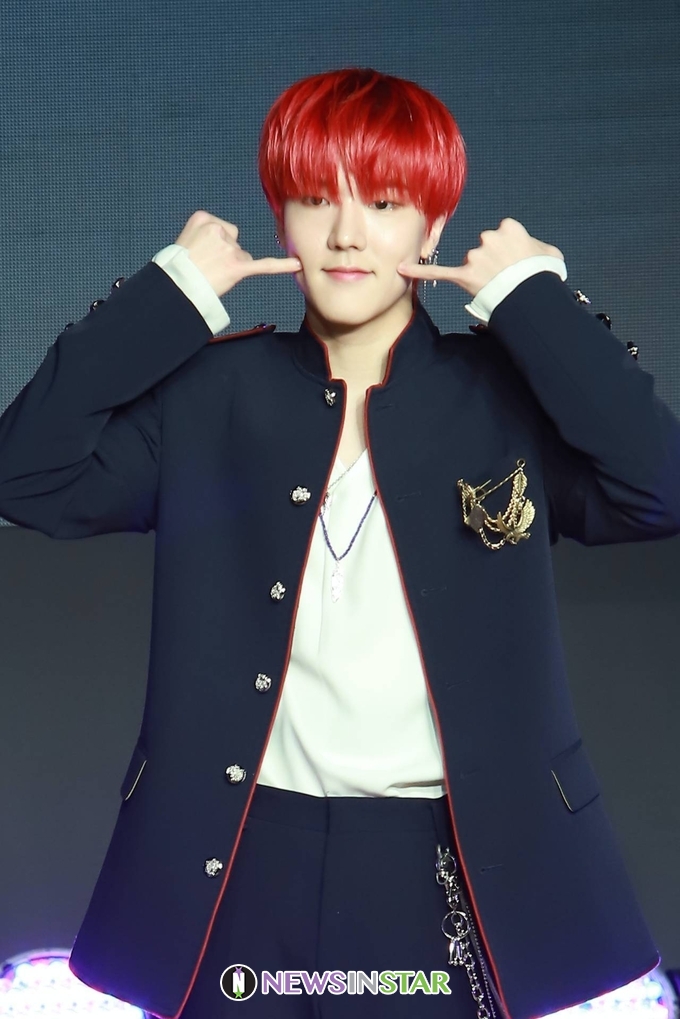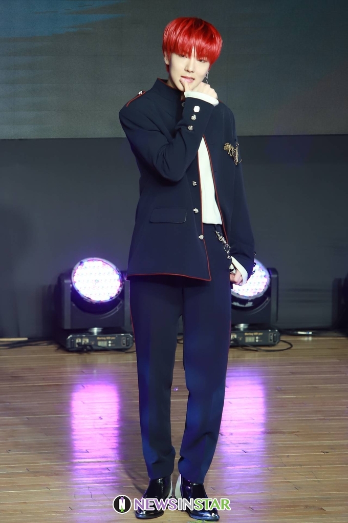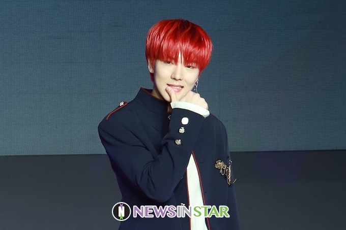 1월 13일 오후 서울시 강남구 청담동 일지아트홀에서 그룹 ENOi(이엔오아이) 라온, 하민, 제이키드, 도진, 진우, 건, 어빈의 첫 번째 미니앨범 ‘RED_in the Apple(레드 인 디 애플)' 발매 기념 쇼케이스에서 멤버 제이키드가 포토타임을 갖고 있다.
