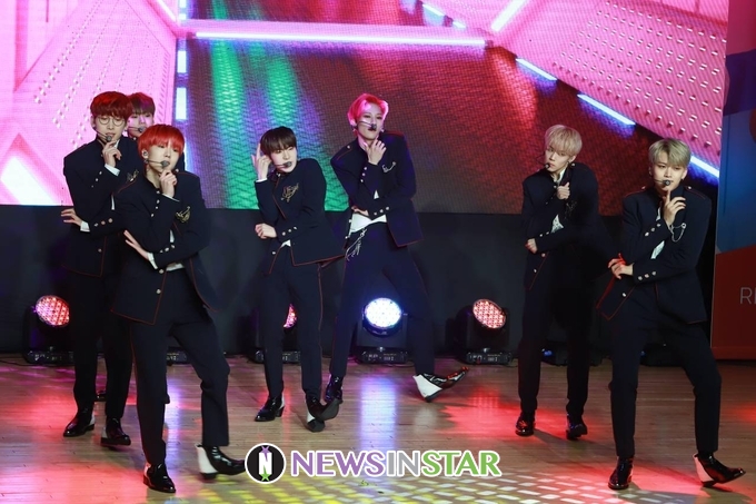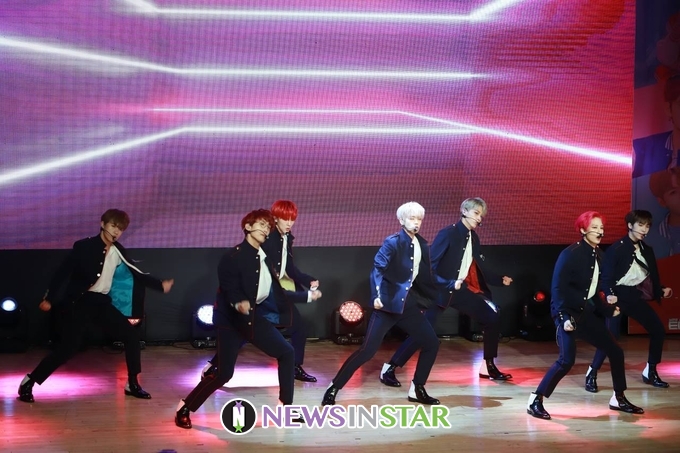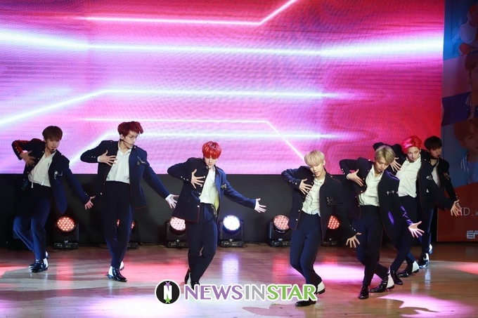 1월 13일 오후 서울시 강남구 청담동 일지아트홀에서 그룹 ENOi(이엔오아이) 라온, 하민, 제이키드, 도진, 진우, 건, 어빈의 첫 번째 미니앨범 ‘RED_in the Apple(레드 인 디 애플)' 발매 기념 쇼케이스에서 타이틀곡 '발칙하게' 무대를 선보이고 있다.