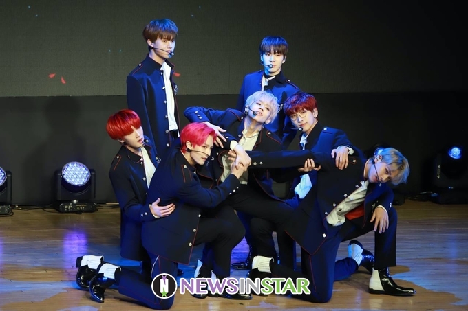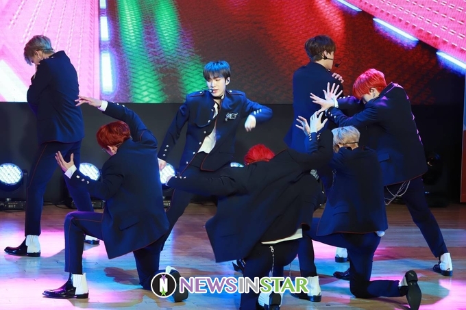 1월 13일 오후 서울시 강남구 청담동 일지아트홀에서 그룹 ENOi(이엔오아이) 라온, 하민, 제이키드, 도진, 진우, 건, 어빈의 첫 번째 미니앨범 ‘RED_in the Apple(레드 인 디 애플)' 발매 기념 쇼케이스에서 타이틀곡 '발칙하게' 무대를 선보이고 있다.