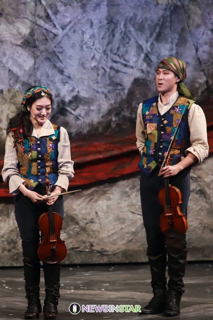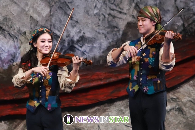 1월 14일 서울시 서초구 예술의 전당 오페라극장에서 뮤지컬 '웃는 남자' 프레스콜 행사가 열려 바이올리니스트 허재연, 고예일이 포토타임을 갖고 있다.