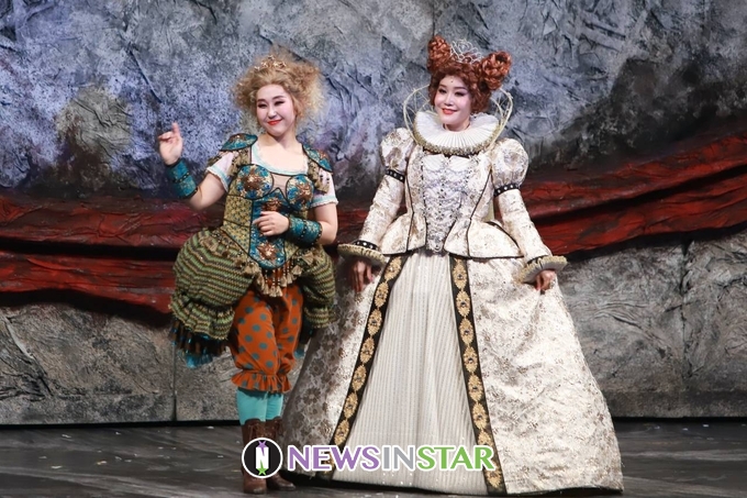 1월 14일 서울시 서초구 예술의 전당 오페라극장에서 뮤지컬 '웃는 남자' 프레스콜 행사가 열려 앤 여왕과 비너스 1인 2역의 김경선, 한유란이 포토타임을 갖고 있다.