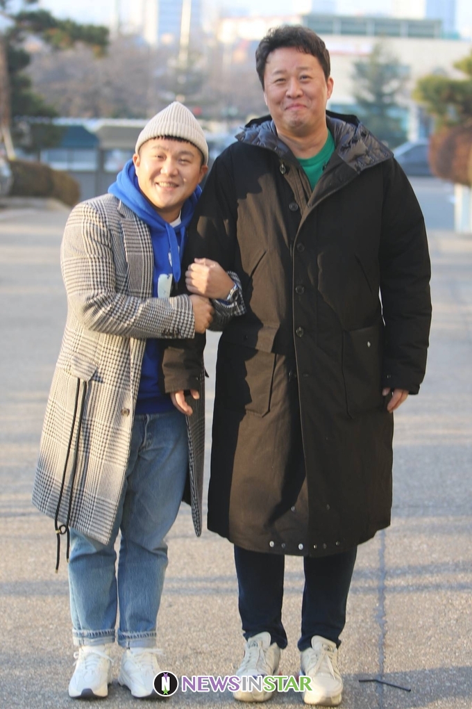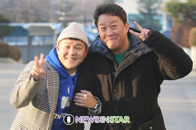이날 정준하, 조세호가 출근길에 포즈를 취하고 있다.