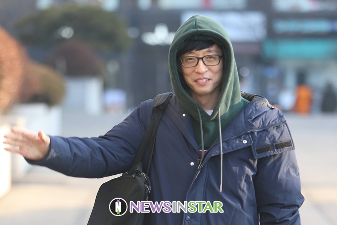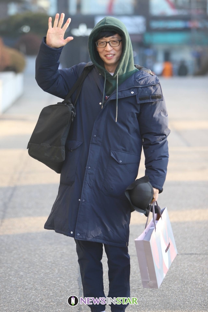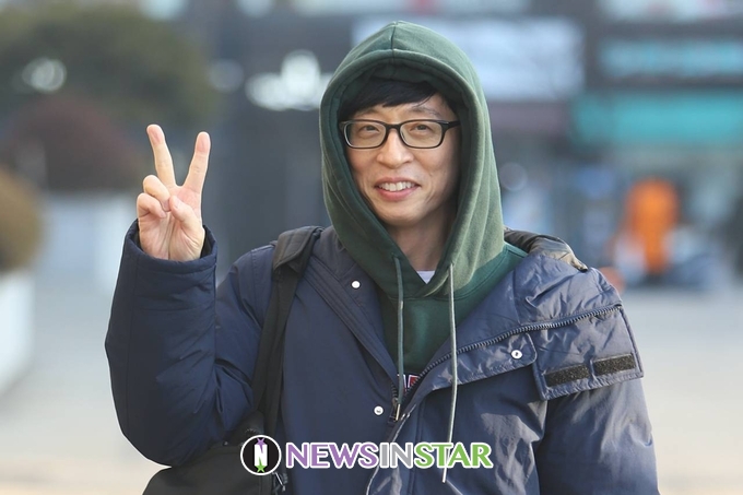 이날 유재석이 출근길에 포즈를 취하고 있다.