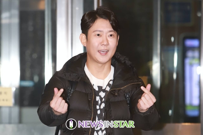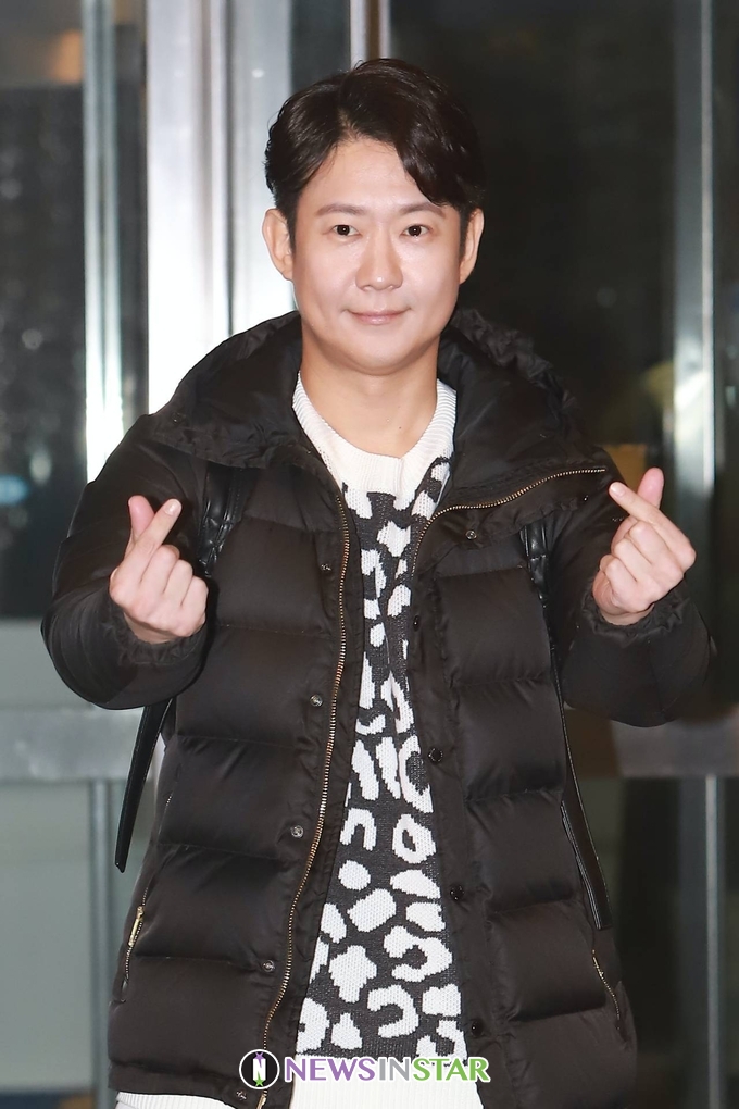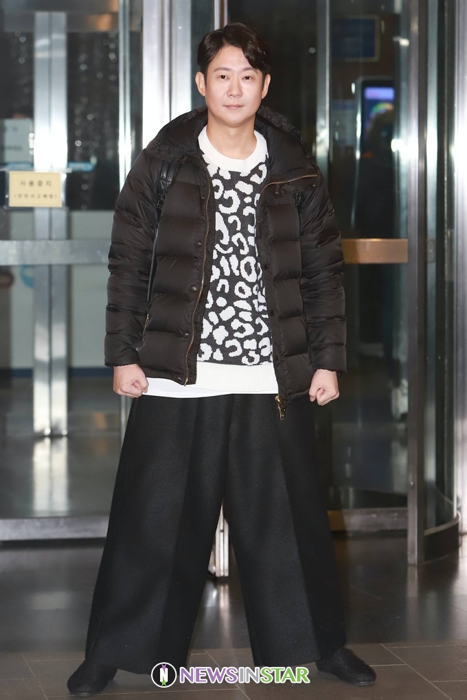이날 천명훈이 출근길에 포즈를 취하고 있다.