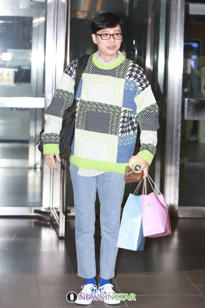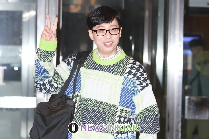 이날 유재석이 출근길에 포즈를 취하고 있다.