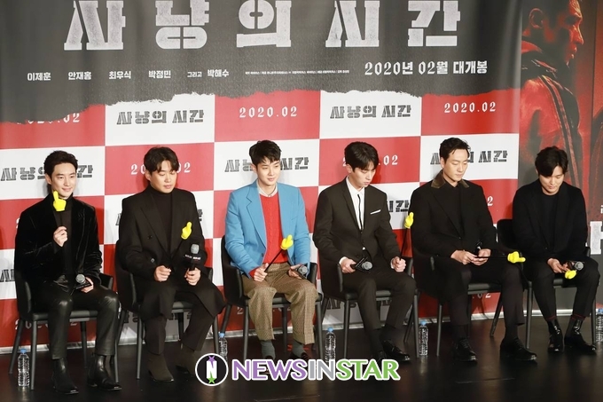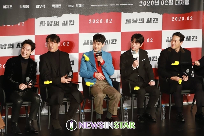 31일 오전 서울시 광진구 자양동 롯데시네마 건대입구에서 영화 ‘사냥의 시간(Time to Hunt)’ 제작보고회가 열려 배우 이제훈, 안재홍, 최우식, 박정민, 박해수와 윤성현 감독이 참석해 영화 관련 키워드 지목 토크를 하고 있다.