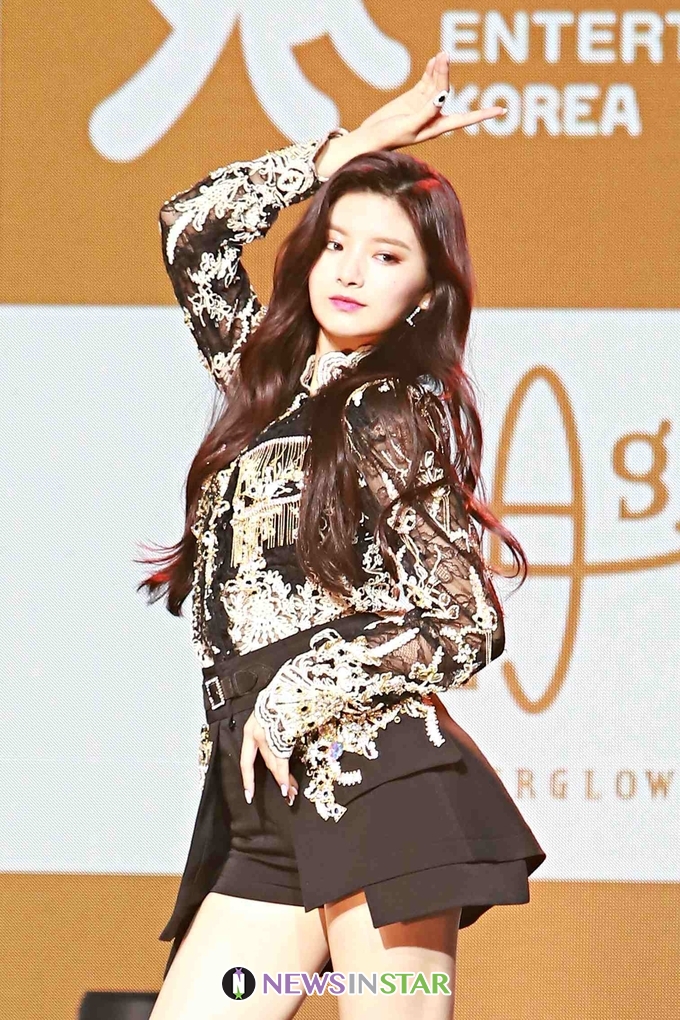 3일 오후 서울시 용산구 한남동 블루스퀘어에서 에버글로우(EVERGLOW) 이유, 시현, 미아, 온다, 아샤, 이런이 첫 미니앨범 '레미니선스(reminiscene)' 쇼케이스가 열려 이런이 포토타임을 갖고 있다.