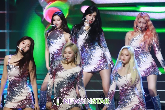 3일 오후 서울시 용산구 한남동 블루스퀘어에서 에버글로우(EVERGLOW) 이유, 시현, 미아, 온다, 아샤, 이런이 첫 미니앨범 '레미니선스(reminiscene)' 쇼케이스가 열려 수록곡 'SALUTE' 무대를 선보이고 있다.