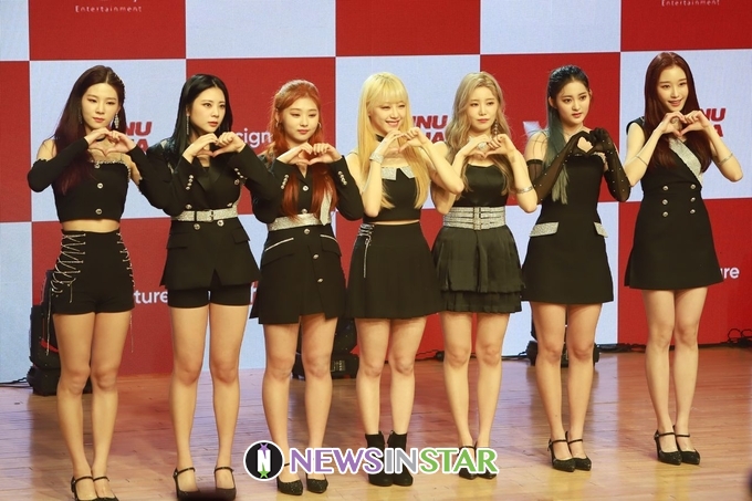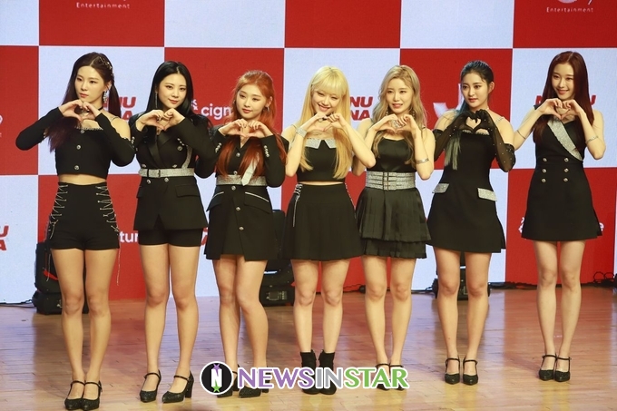 4일 오후 서울시 강남구 청담동 일지아트홀에서 신예 걸그룹 시그니처(cignature) 채솔, 지원, 예아, 선, 셀린, 벨, 세미의 데뷔 리드 싱글 A ‘눈누 난나(Nun Nu Nan Na)’ 발매 기념 쇼케이스가 열려 멤버 가 포토타임에 포즈를 취하고 있다.