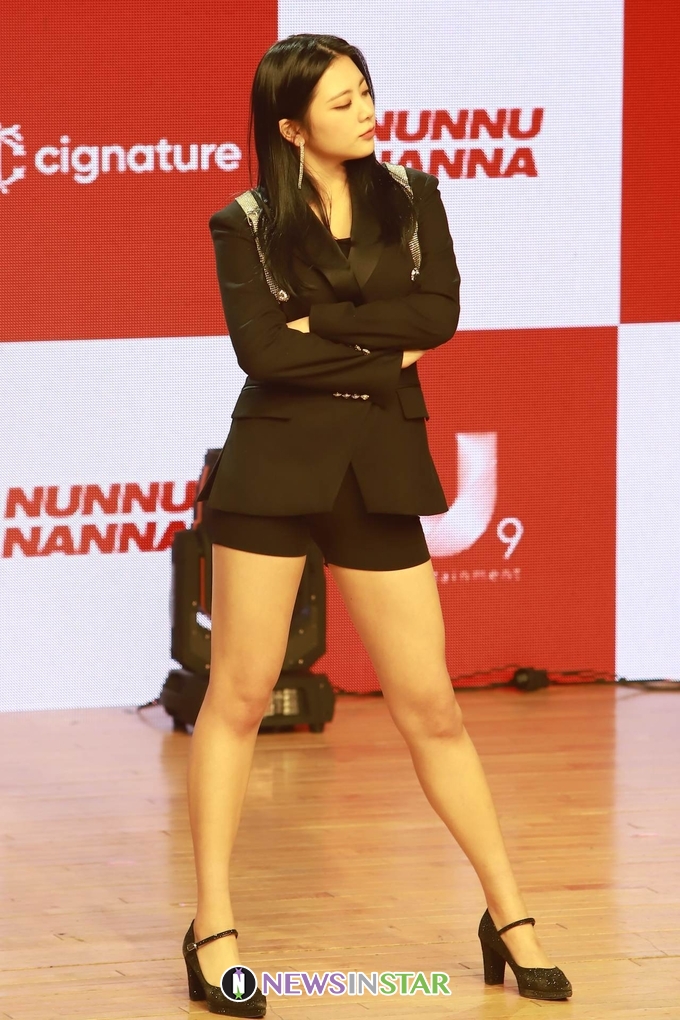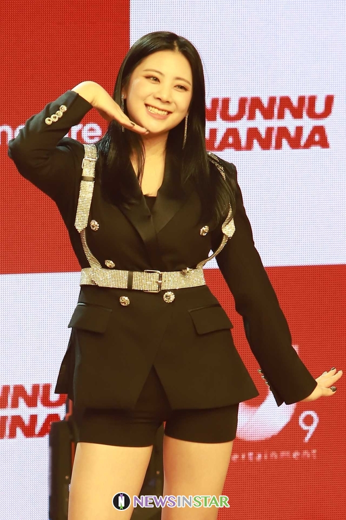 4일 오후 서울시 강남구 청담동 일지아트홀에서 신예 걸그룹 시그니처(cignature) 채솔, 지원, 예아, 선, 셀린, 벨, 세미의 데뷔 리드 싱글 A ‘눈누 난나(Nun Nu Nan Na)’ 발매 기념 쇼케이스가 열려 멤버 선이 포토타임에 포즈를 취하고 있다.
