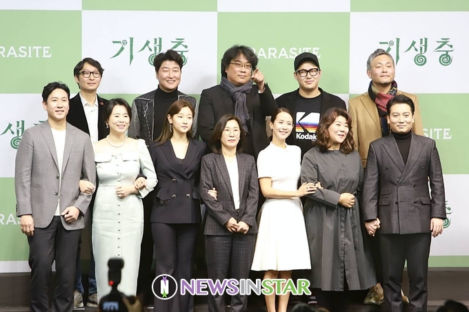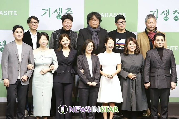 19일 오전 서울시 중구 소공동 웨스틴 조선 서울호텔에서 영화 '기생충' 기자회견이 열려 배우 박명훈, 장혜진, 이정은, 박소담, 송강호, 이선균, 조여정, 봉준호 감독, 곽신애 대표, 한진원 작가, 이하준 미술감독, 양진모 편집감독이 참석했다.