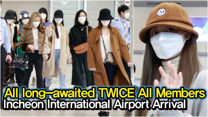 2월 24일 오후 인천시 중구 운서동 인천국제공항에서 트와이스(TWICE) 나연, 정연, 모모, 사나, 지효, 다현, 채영, 쯔위, 미나가 해외 일정을 마치고 일본 나고야에서 입국하고 있다.