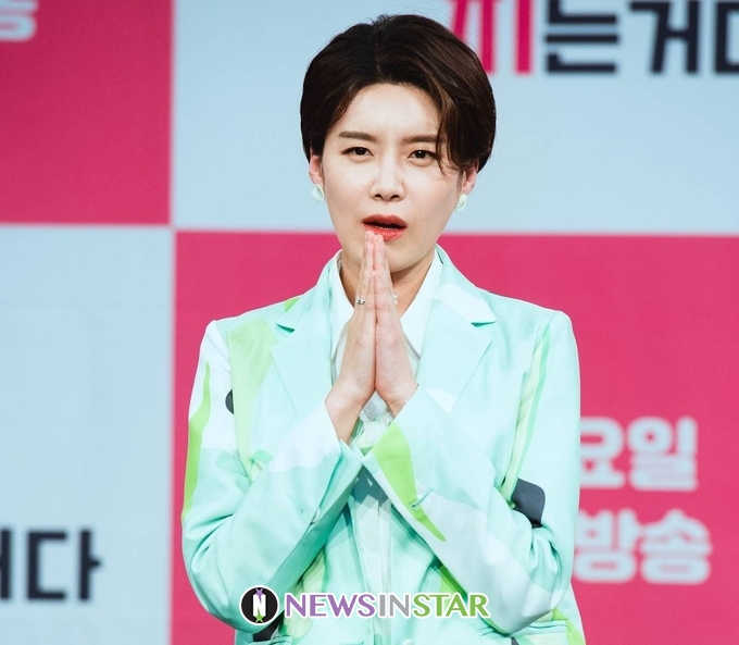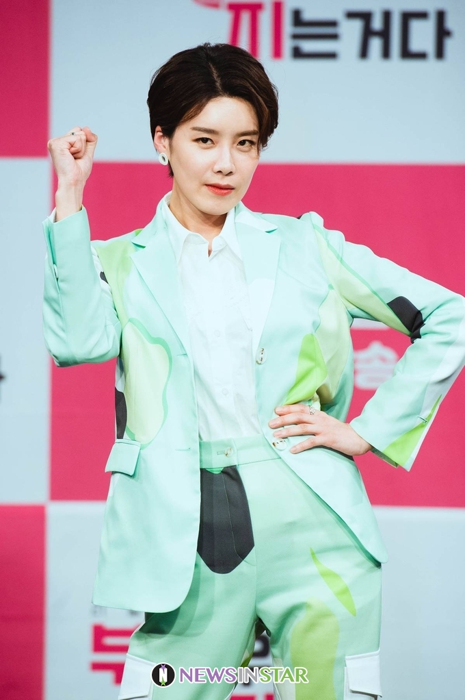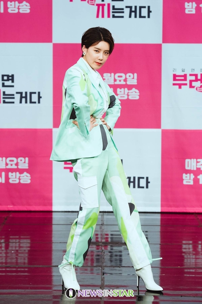 13일 오후 MBC 리얼 연애 ‘부러우면 지는거다’ 온라인 기자간담회 열려 5MC 장성규, 장도연, 허재, 라비, 전소미가 참석해 장도연이 포토타임을 갖고 있다.