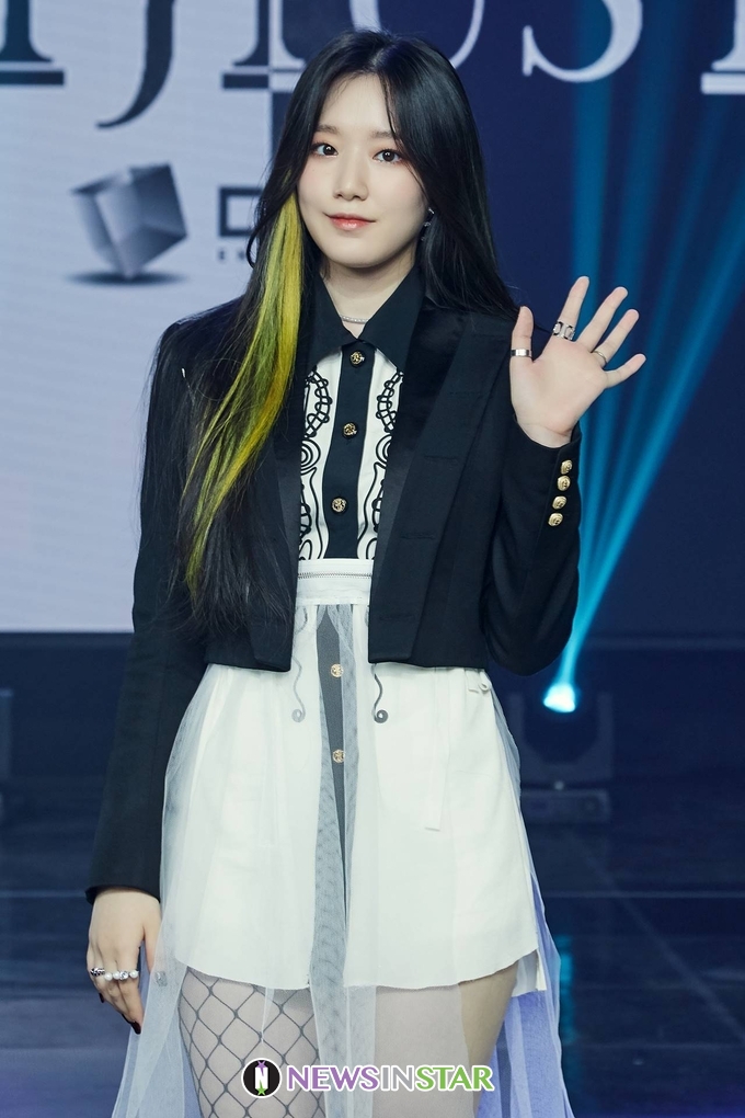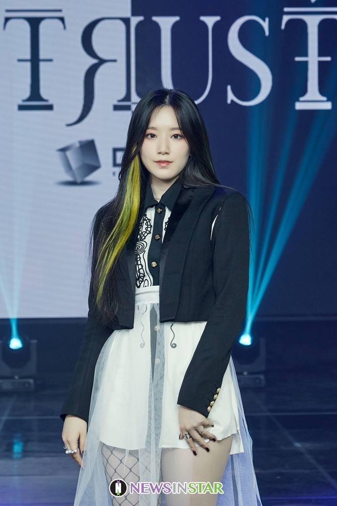 4월 6일 오후 (여자)아이들(G)I-DLE의 3rd 미니앨범 'I trust'의 온라인 쇼케이스가 열려 슈화가 포토타임에 포즈를 취하고 있다.