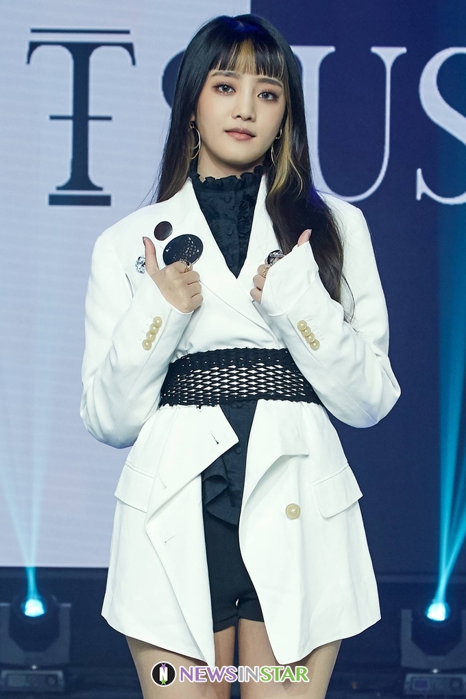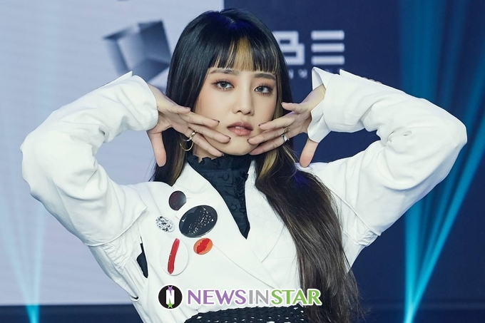 4월 6일 오후 (여자)아이들(G)I-DLE의 3rd 미니앨범 'I trust'의 온라인 쇼케이스가 열려 민니가 포토타임에 포즈를 취하고 있다.
