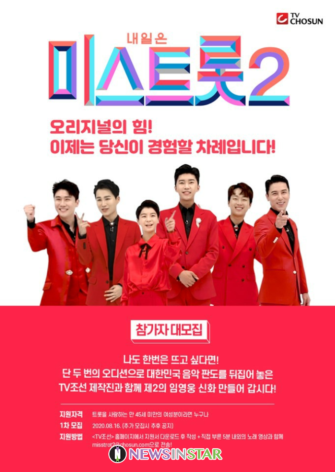 한편 ‘미스트롯2’는 트롯을 사랑하는 만 45세 미만 여성이라면 누구나 지원 가능하다. 참가 지원서를 작성한 후 간단한 자기소개와 함께 직접 부른 노래가 담긴 5분 내외 영상을 첨부하는 방식으로, 1차 모집은 오는 8월 16일까지다. 자세한 내용은 공식 홈페이지 내 공지사항을 통해 확인할 수 있다.
