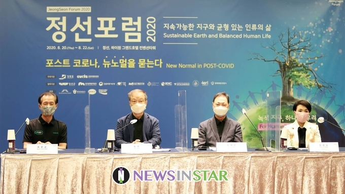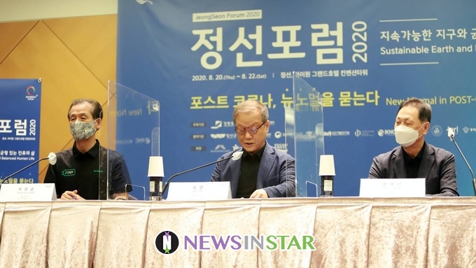 [뉴스인스타 양철수 기자] 8월 20일(목) 강원도 정선군 하이원리조트 그랜드호텔 컨벤션타워에서 진행된 `정선포럼 2020 : 지속가능한 지구와 균형 있는 인류의 삶` 기자회견이 열려 공동 조직위원장인 최열 환경재단 이사장, (주)비와이블랙야크 강태선 회장, 지구와 사람 강금실 대표와 최문순 강원도지사가 참석했다.