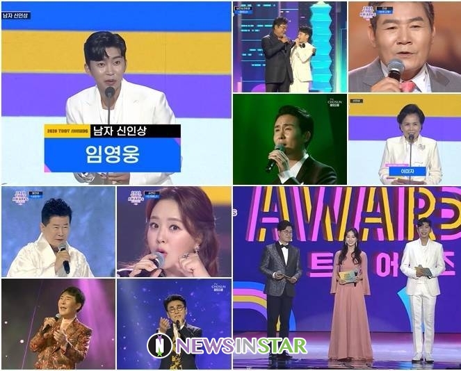 이어 ‘2020 트롯 어워즈’ 첫 번째 시상인 ‘트롯 남자 신인상’과 ‘트롯 여자 신인상’을 발표하기 위해 ‘전통가요 여제’ 이미자가 모습을 드러냈다. ‘트롯 남자 신인상’은 임영웅이, ‘트롯 여자 신인상’은 송가인에게 돌아가며 인생에 단 한 번뿐인 트롯 신인상을 전통가요의 산증인인 이미자로부터 받았다는 점에서 더욱 소중한 의미를 더했다.