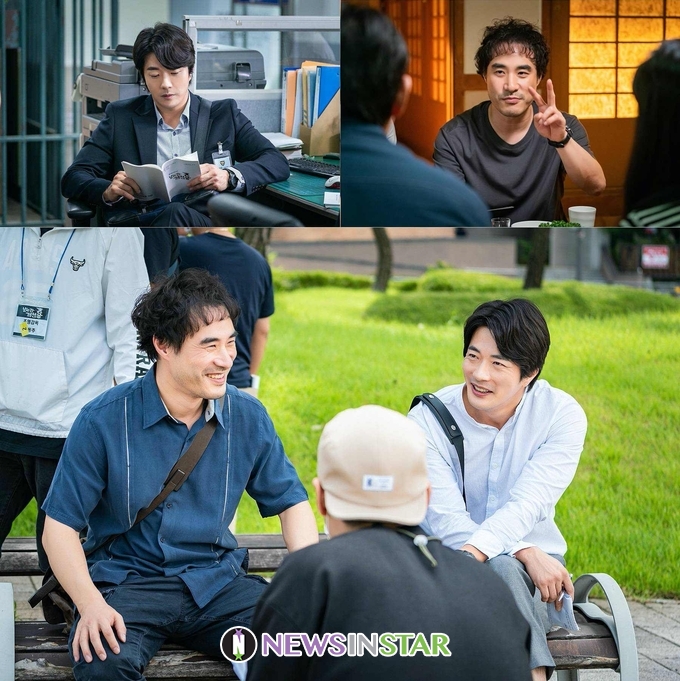 타고난 ‘글발’ 하나로 사람들의 마음을 쥐락펴락하는 생계형 기자 ‘박삼수’로 완벽 빙의한 배성우 역시 열정 충만한 모습. 촬영 틈틈이 곽정환 감독과 의견을 주고받는 그의 진지한 눈빛에서 사소한 디테일도 놓치지 않으려는 노련함이 엿보인다. 카메라를 향해 브이를 만들어 보이는 배성우의 ‘장꾸美’ 넘치는 모습에서 유쾌한 현장 분위기도 느낄 수 있다. 박상규 작가는 “배성우 배우는 투박하지만 내면은 여린 박삼수 기자를 120% 구현해냈다. 그는 박삼수 그 자체다”라고 극찬하기도. 이어진 사진 속 권상우와 배성우의 화기애애한 모습도 눈길을 끈다. 촬영이 쉬는 시간에도 캐릭터의 감정선에 대해 치열하게 고민하고 이야기를 나누는 두 사람의 모습이 흥미롭다. 사진만 봐도 퍼펙트 케미를 발산하는 권상우와 배성우가 완성할 정의구현 역전극은 어떤 모습일지, 시청자들을 웃기고 울릴 두 사람의 거침없는 반란에 귀추가 주목된다.