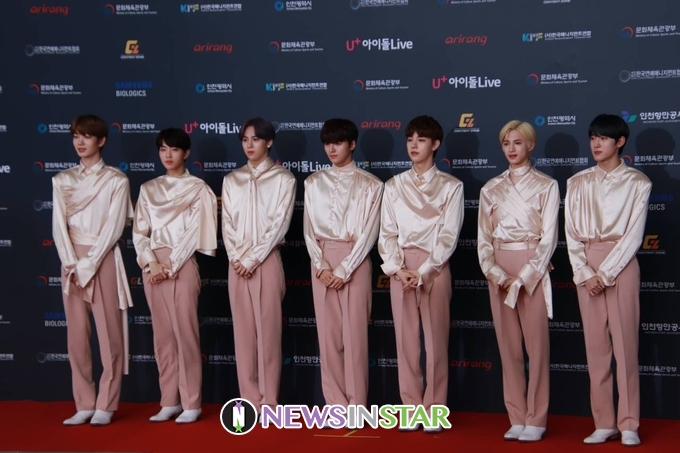 [뉴스인스타 양철수기자] 10월 31일(토) 오후 인천시 연수구 인천국제여객터미널에서 열린 ‘2020 코리아뮤직 드라이브 인 페스티벌(KMDF)’ 레드카펫 행사에 드리핀(DRIPPIN) 차준호, 황윤성, 김동윤, 이협, 주창욱, 알렉스, 김민서가 참석해 포즈를 취하고 있다.