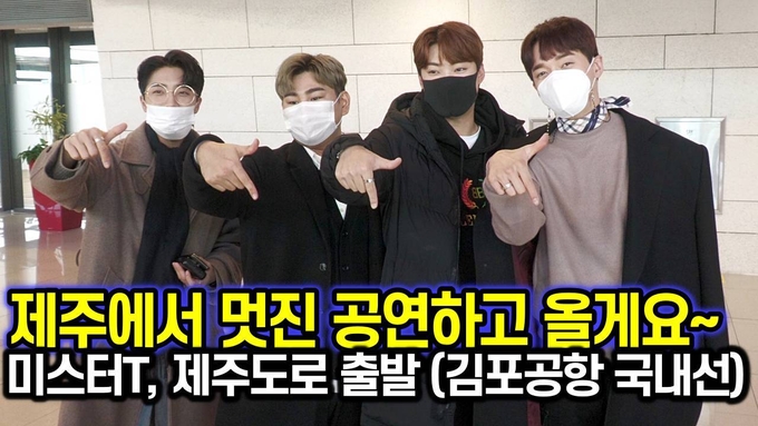 [뉴스인스타 양철수기자] 11월 23일(월) 오후 서울시 강서구 방화동 김포공항 국내선터미널에서 트롯아이돌 미스터T 이대원, 강태관, 황윤성, 김경민이 제주 공연을 위해 탑승장으로 이동하고 있다.