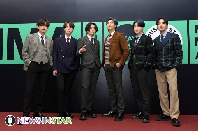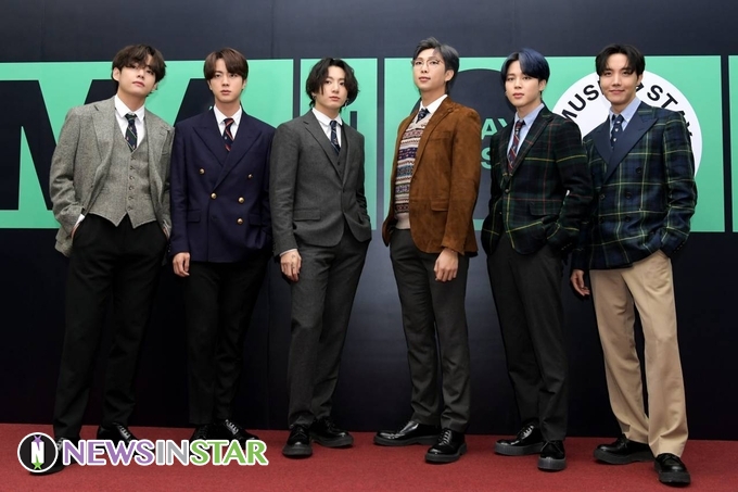 12월 5일(토) 진행되는 카카오의 뮤직플랫폼 멜론이 개최하는 대중음악시상식 ‘MMA 2020’(멜론뮤직어워드 2020)이 진행되어 그룹 방탄소년단(BTS) RM, 진, 슈가, 제이홉, 지민, 뷔, 정국이 포토월에 참석해 포토타임을 갖고 있다.