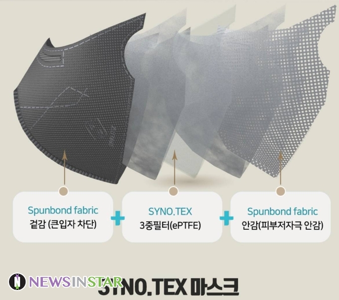 시노텍스 마스크에 필터로 사용되는 소재(ePTFE)는 희토류 계열의 형석에서 추출한 자연 소재로 알려져 있으며, 생체적합성 뛰어나 인공혈관 등에 사용 될 정도로 안전성이 입증된 제품이다.