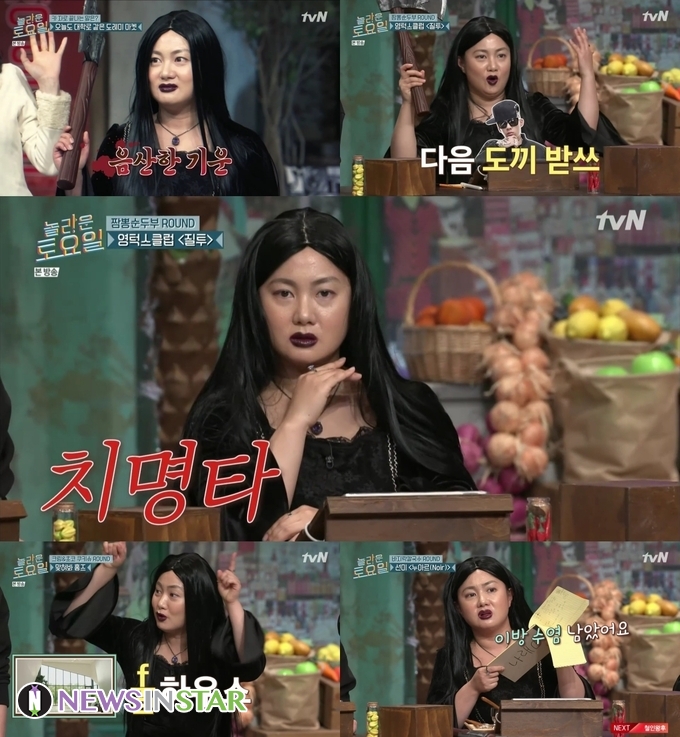 오프닝에서 박나래는 ‘카’로 끝나는 날 특집에 맞춰 시트콤 ‘프란체스카’로 분장하고 등장했다. 검은 생머리와 도끼 소품으로 그로테스크한 분위기를 만든 박나래는 정답을 외칠 때마다 도끼를 휘두르며 모두를 제압하는가 하면, 오디 혹은 복분자빛 입술색으로 시선 강탈과 함께 존재감을 과시했다.