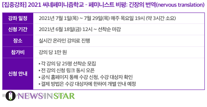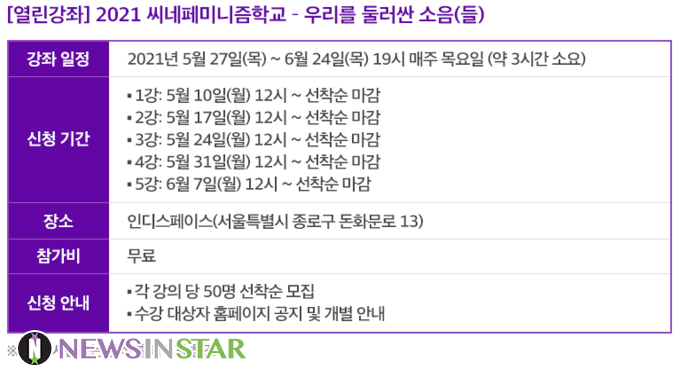 영화를 통해 여성주의와 성평등 현안에 관해 토론하고 영화 비평의 다채로운 시각을 제공하는 <2021 씨네페미니즘학교> 강좌 시간표 및 수강 신청 방법에 대한 자세한 사항은 공식 홈페이지(www.siwff.or.kr) 및 기획사업팀(archive@siwff.or.kr)으로 문의하면 된다.