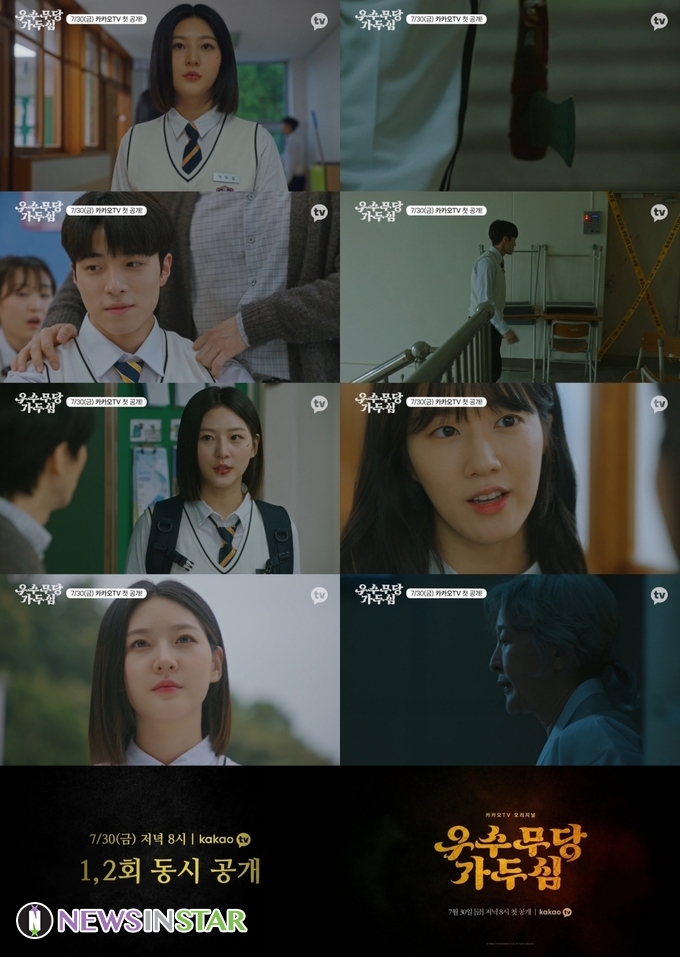 이런 상황에서 학생들은 성적 공개 후 전교 꼴등이 누구인지만 관심을 가지고, 100% 자살로 보이는 사건에 대해 “자살이 아니야”라고 말하는 등 기묘한 분위기를 더하며 사건의 전말에 대한 호기심을 자극한다. 더욱이 전학을 가자마자 대형 사건을 마주한 두심은 운동복에 도끼까지 든 채 미스터리한 정체와 대결을 벌일 것을 예고해 30일(금) 오후 8시 동시 공개될 <우수무당 가두심> 1-2화에 대한 궁금증을 수직 상승시켰다.