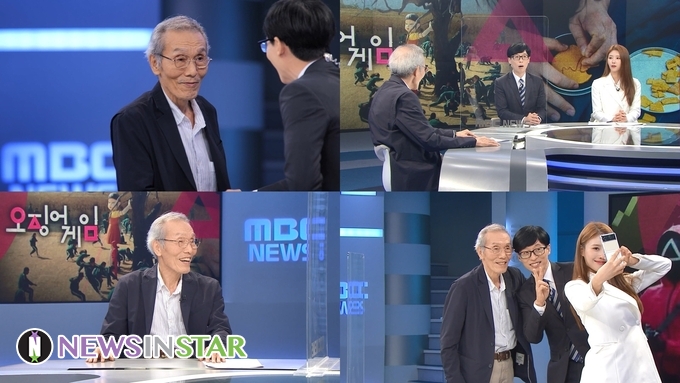 공개된 사진 속에는 ‘놀면 뭐하니?+’의 ‘뉴스데스크+’의 초대석 현장이 담겨있다. 초대석의 주인공은 전세계 신드롬을 일으키고 있는 ‘오징어 게임’의 001번 참가자 ‘오일남 역’을 맡은 배우 오영수.