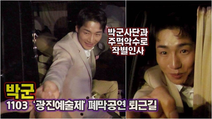 [뉴스인스타 양철수기자] 11월 3일(수) 오후, 서울시 광진구 나루아트센터에서 진행되는 제1회 광진예술제 폐막 축하공연을 마치고 트로트특전사 박군이 퇴근하며 팬들과 인증샷과 주먹 악수를 하고 있다.