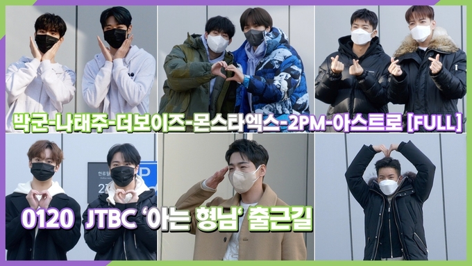 [뉴스인스타 양철수기자] 1월 20일(목) 오전, 경기도 고양시 JTBC일산 스튜디오에서 열린 JTBC 예능 ‘아는 형님’ 녹화에 참석하기 위해 그룹 더보이즈(The Boyz) 큐-주연, 몬스타엑스(MOSNSTA X) 주헌-민혁, 2PM 우영-준케이, 아스트로 윤산하-문빈, 트롯가수 박군, 나태주가 스튜디오에 도착해 포토타임을 갖고 있다.