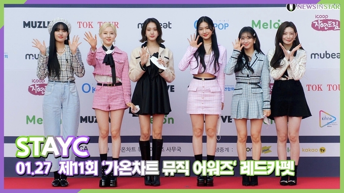 [뉴스인스타 양철수기자] 1월 27일(목) 오후, 서울시 송파구 잠실동 서울종합운동장 잠실실내체육관에서 생방송으로 진행되는 제11회 '가온차트 뮤직 어워즈' 레드카펫 행사에 그룹 스테이씨(STAYC) 수민, 시은, 아이사, 세은, 윤, 재이가 참석해 포토타임을 갖고 있다.