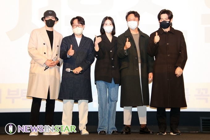 [뉴스인스타 양철수기자] 1월 29일(토) 오후, 서울시 용산구 CGV 용산아이파크몰에서 진행되는 영화 '킹메이커' 무대인사에 참석하기 위해 배우 설경구,전배수,서은수,윤세웅,김성오가 무대에서 팬들에게 인사를 하고 있다. 이날 참석 예정이었던 이선균 배우는 밀접 접촉자로 불참