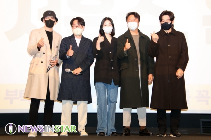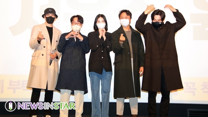 [뉴스인스타 양철수기자] 1월 29일(토) 오후, 서울시 용산구 CGV 용산아이파크몰에서 진행되는 영화 '킹메이커' 무대인사에 참석하기 위해 배우 설경구,전배수,서은수,윤세웅,김성오가 무대에서 팬들에게 인사를 하고 있다. 이날 참석 예정이었던 이선균 배우는 밀접 접촉자로 불참