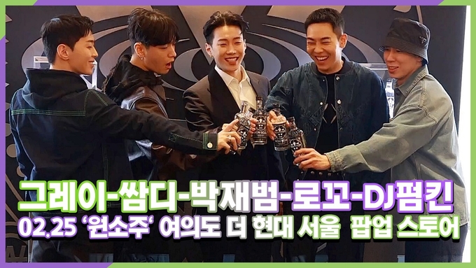 [뉴스인스타 양철수기자] 2월 25일(금) 오전, 서울시 영등포구 여의도 '더 현대 서울'에서 열린 ‘원소주(WONSOJU)’ 출시기념 팝업 스토어 오픈 행사에 가수 가수 박재범, 사이먼 도미닉, 로꼬, 그레이, DJ 펌킨이 참석해 포토타임을 갖고 있다.