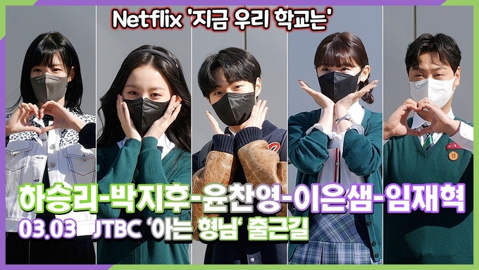 [뉴스인스타 양철수기자] 3월 3일(목) 오전, 경기도 고양시 일산동구 장항동 JTBC스튜디오 일산에서 진행되는 JTBC '아는 형님' 녹화를 위해 넷플릭스 '지금 우리 학교는' 배우 윤찬영-이은샘-박지후-임재혁-하승리가 방송국에 도착해 포즈를 취하고 있다.