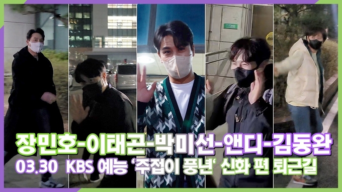 [뉴스인스타 양철수기자] 3월 30일(수) 오후, 서울시 영등포구 여의도 KBS에서 진행된 KBS 예능 '주접이 풍년' 출연을 마치고 MC 장민호, 박미선, 장민호와 신화 앤디, 김동완이 방송국을 나서고 있다.