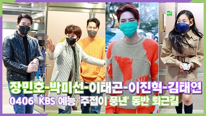 [뉴스인스타 양철수기자] 4월 6일(수) 오후, 서울시 영등포구 여의도 KBS에서 진행된 KBS 예능 '주접이 풍년' 출연을 마치고 미스터트롯 장민호, 박미선, 이태곤, 이진혁, 김태연, 리틀싸이 황민우 형제가 방송국을 나서고 있다.