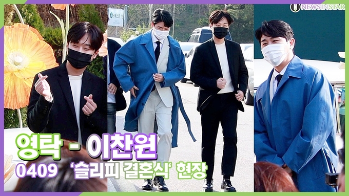 [뉴스인스타 양철수기자] 4월 9일(토) 오후, 서울시 중구 장충동 한 결혼식장에서 열린 가수 '슬리피' 결혼식에 미스터트롯 영탁, 이찬원이 하객으로 도착하고 있다.