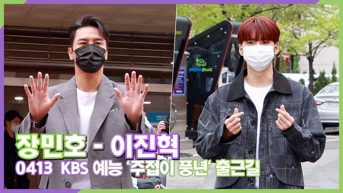 [뉴스인스타 양철수기자] 4월 13일(수) 오후, 서울시 영등포구 여의도 KBS에서 진행된 KBS 예능 '주접이 풍년' 녹화를 위해 미스터트롯 장민호, 이진혁이 방송국에 도착하고 있다.