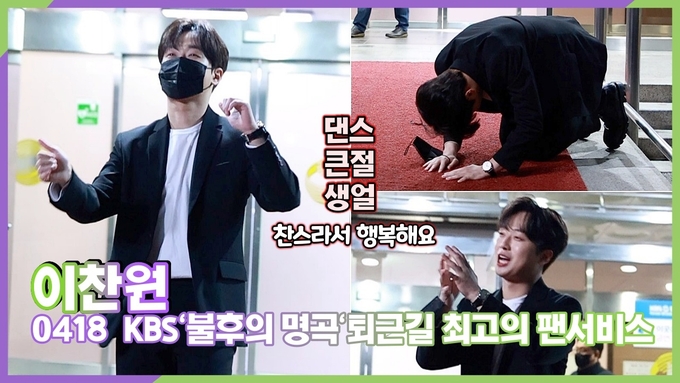 [뉴스인스타 양철수기자] 4월 18일(월) 오후, 서울시 영등포구 여의도 KBS 공개홀에서 진행된 KBS 2TV '불후의 명곡' 신동 특집 녹화를 마치고 MC 이찬원이 방송국을 나서며 SBS MTV '더 트롯쇼' 1위를 축하해주는 팬들에게 댄스와 큰절 그리고 마스크를 벗고 생얼로 인사를 해, 열응하는 찬스들에게 큰 선물을 주었다.