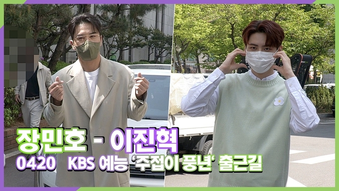 [뉴스인스타 양철수기자] 4월 20일(수) 오후, 서울시 영등포구 여의도 KBS에서 진행된 KBS 예능 '주접이 풍년' 녹화를 위해 미스터트롯 장민호와 아이돌 가수 이진혁이 방송국에 도착해 포즈를 취하고 있다.