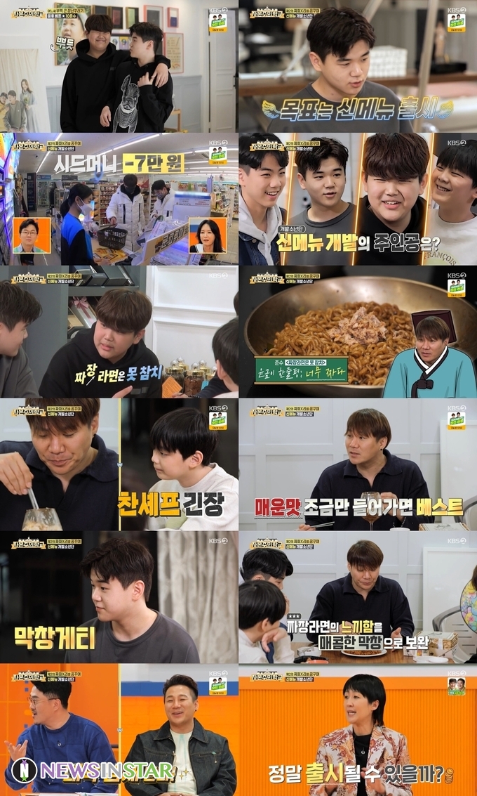 아이들은 시드머니로 사 온 다양한 재료들로 저마다 신메뉴를 내놓았다. 먼저 준수는 짜장라면에 라면 수프를 섞은 참치를 올린 ‘짜장라면은 못 참치’를 내놓았다. 맛 평가단으로 나선 자칭 ‘윤장금’ 윤민수는 “너무 짜다” 평을 내렸다.